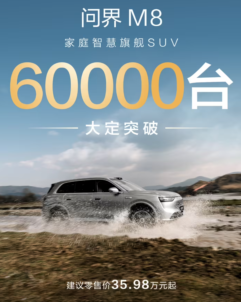 问界M7和问界M9都能成功,所以在两款车型之间的问界M8大概率也是能成功的;其实问界M8目前已经算成功了——上市4天大定突破5万,昨天宣布大定突破6万,这个成绩也说明M8未来的销量是有保障的。