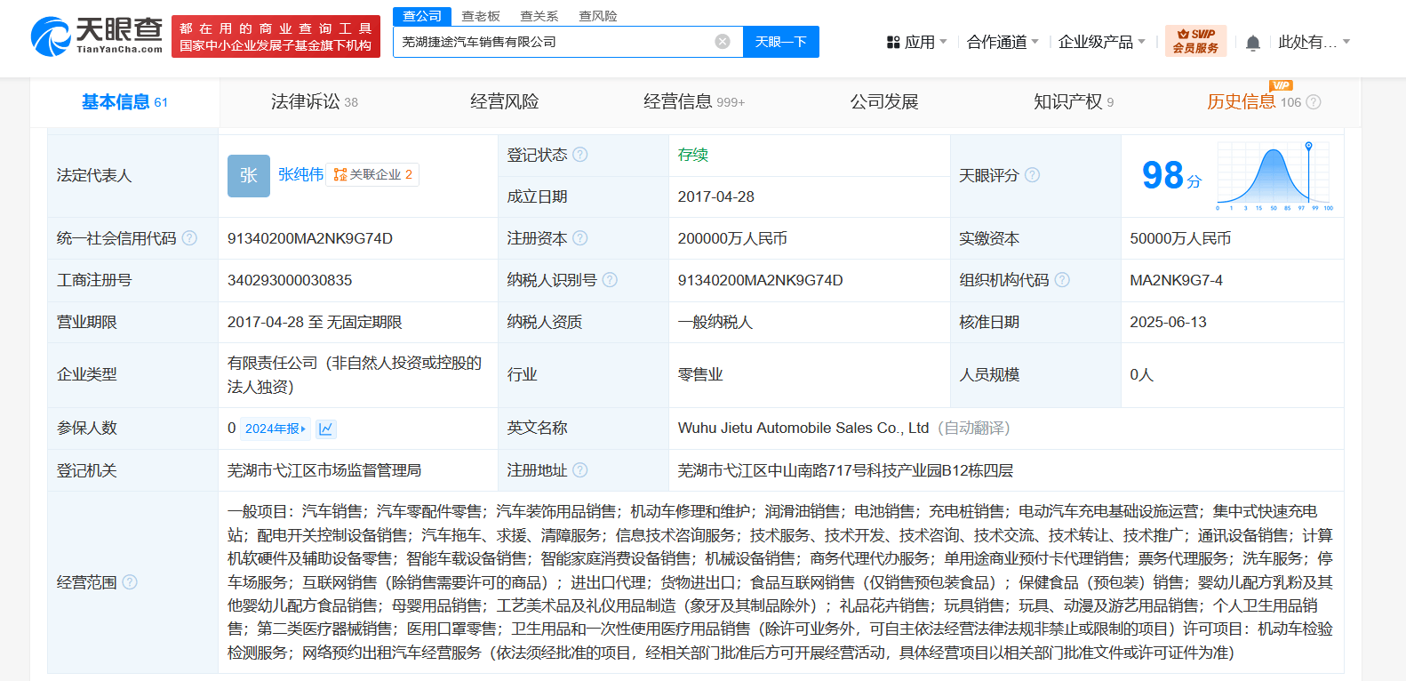 该公司成立于2017年4月,法定代表人为张纯伟,经营范围含汽车销售、汽车零配件零售、汽车装饰用品销售、机动车修理和维护、润滑油销售、电池销售、充电桩销售、电动汽车充电基础设施运营等,由奇瑞汽车股份有限公司全资持股。